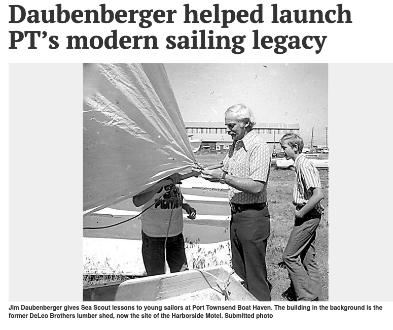 Jim “Daubie” Daubenberger’s passion for sailing took him to the water for the first time in 1937, when, at the age of 13, he hatched a plan to sail Discovery Bay in a rented rowboat using his dad’s pup tent for a sail.