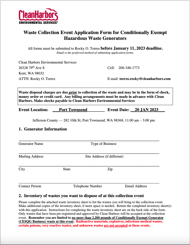 Businesses that qualify as Small Quantity Generators in Jefferson County may dispose of dangerous waste at this event. Businesses must preregister for this collection event using this form. Businesses must complete the form by January 11, 2023 and deliver via e-mail to: torres.rocky@cleanharbors.com or via USPS to: Attention Rocky Torres, Clean Harbors Environmental Services, 26328 79th Ave. S., Kent, WA 98032.