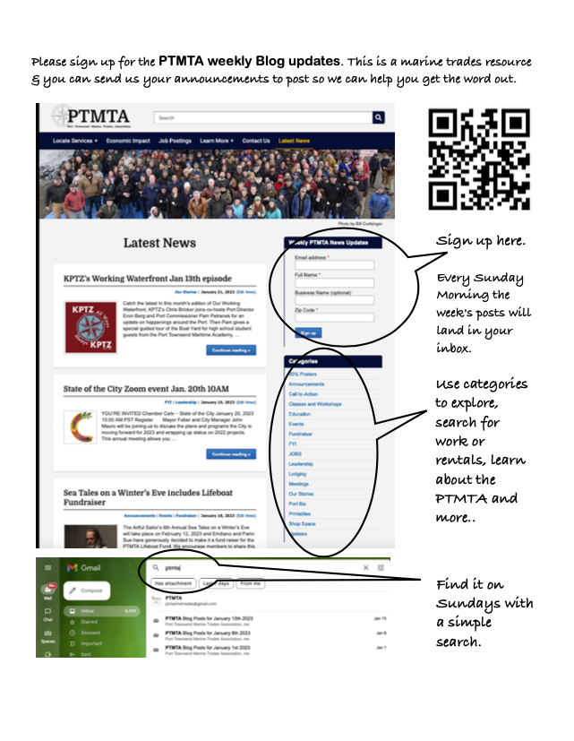 This is a marine trades resource for all of our Marine Trades Community to make use of. You can also send us your announcements to post so we can help you get the word out. Once signed up, one email every Sunday, will arrive to your inbox. If your inbox allows you to prioritize emails from specific senders, please mark this one as important so it is not lost in Spam.