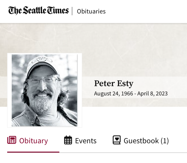 Seattle, WA — Peter Tuckerman Esty Jr., of Seattle and Port Townsend, WA, formerly of Deerfield and Wareham, MA, passed away on April 8, 2023, leaving his life partner, Anne Krier. Predeceased by his father, Peter T. Esty, he additionally leaves his mother, Athalia (Happy) Barker Esty, of Andover, MA, his brother Jay and his wife Susan, also of Andover, and his sister Leila and her husband Peter Poutiatine, of Tetonia, ID. He was “Uncle Duck” to Charlotte and Athalia Esty, of Boston and Andover, Cameron Poutiatine of Kelly, WY and Isabella and Natasha Poutiatine of Tetonia, ID. He also leaves a slew of Esty and Barker aunts, uncles, cousins, and cousins-in-law, as well as a vast community of wonderful friends in Seattle, along the Pacific Northwest coast, and across the country. His charm and magnetic personality made him an instant friend to all who knew him.