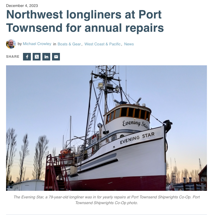 The Port Townsend Shipwrights Co-Op was started in 1981 by eight guys, each one an owner, primarily to repair wooden boats. The owners’ number is now up to twelve, and there’s a lot of work with metal fabrication. But it’s the wooden boat tradition that continues to draw older wooden fishing boats to the co-op. In 2023, besides the Evening Star and St. John II, “a handful of traditional halibut schooners were in,” says Melanya Nordstrom, the co-op’s social media and advertising representative. Compared to the Evening Star and the St. John II, the halibut schooners are the old-timers at the dock.